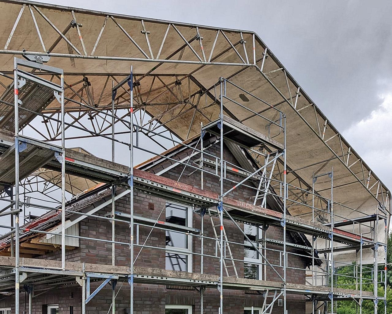 Ein Wetterschutzdach ist eine temporäre Überdachung auf einem Gerüst, die als wetterunabhängiger Schutz für Handwerker, Baustoffe und Fassaden dient. Es schützt bei Regen, Schnee, Frost oder intensiver Sonneneinstrahlung und ermöglicht so den kontinuierlichen Bauprozess ohne Verzögerungen durch Witterungseinflüsse.